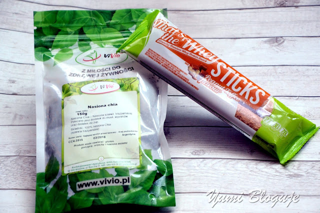 Czułam, że tego cacka nie mogło w tym boxie zabraknąć- mówię tu oczywiście o wspaniałych nasionach Chia, które nie dość że są produktami o szerokim wachlarzu zastosowań, dodatkowo wspaniale smakują i mają wiele wartości odżywczych i błonnika. Idealne, by dołączyć je do zdrowej diety :) Akurat moje zapasy się powoli kończyły, więc posiadanie nowej paczuszki jest idealną sprawą. To, co widzicie po prawej stronie, to batoniki proteinowe o smaku masła orzechowego z toffi. Pamiętacie te poduszeczki do mleka- Jaśki? Smakowało identycznie :) Wszamałam skubańca od razu po zrobieniu zdjęć- pyszny i zdrowy! :D